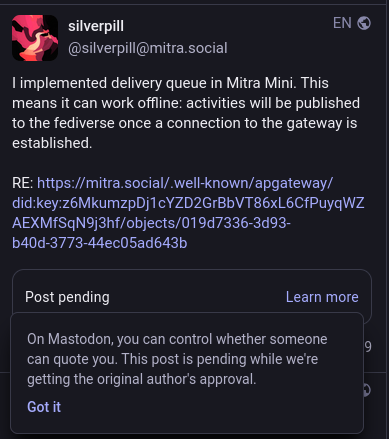 @silverpill Posts quoting minimitra are showing up as pending on Mastodon. (m.otter.homes)