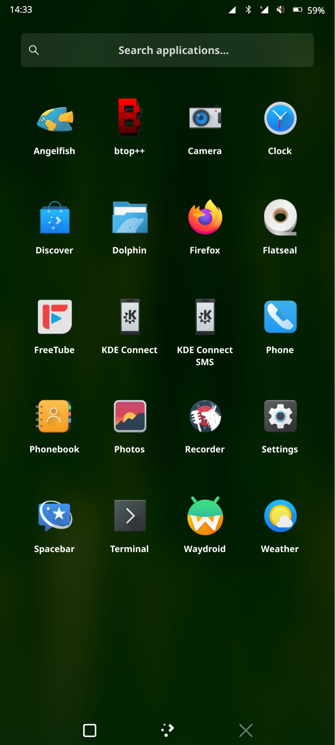 @chameleon_ninja @kde @postmarketOS here's some pictures of the home and app screen.