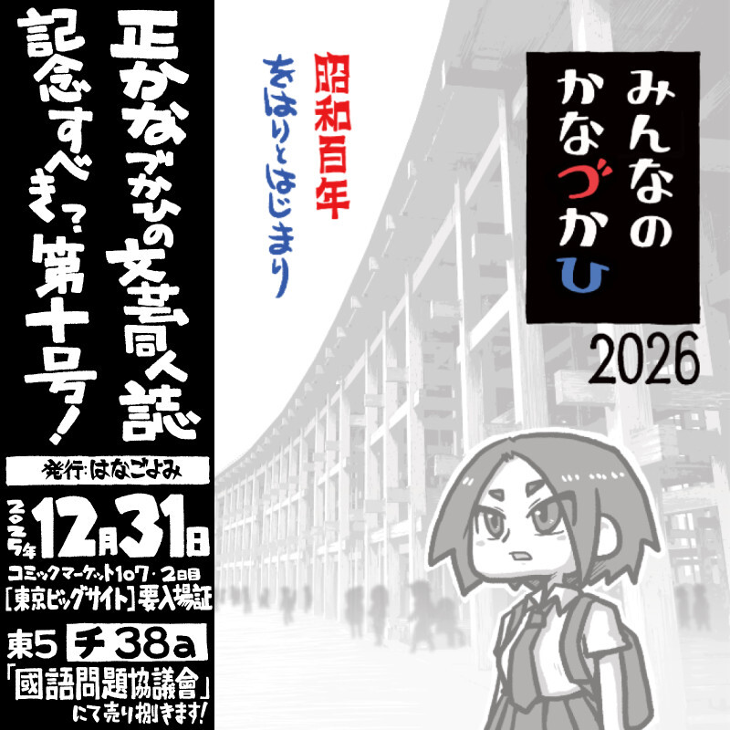 勝手に宣伝。正かなづかひの文芸同人誌「みんなのかなづかひ2026」。今回のテーマは「昭和百年」と「をはりとはじまり」。俺は万博三昧な表紙と漫画を担当してをります。
