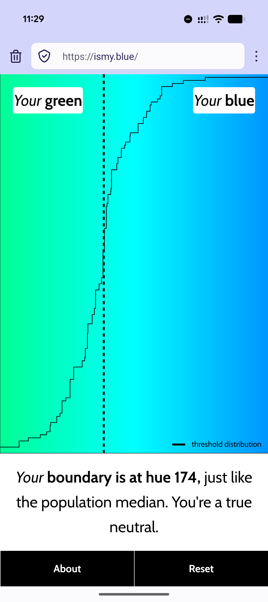 @lina がやっていた、画面の色が青だと思うか緑だと思うか選ぶツール https://ismy.blue/ を使ったら、ちょうど人々の中央値という結果が出た。