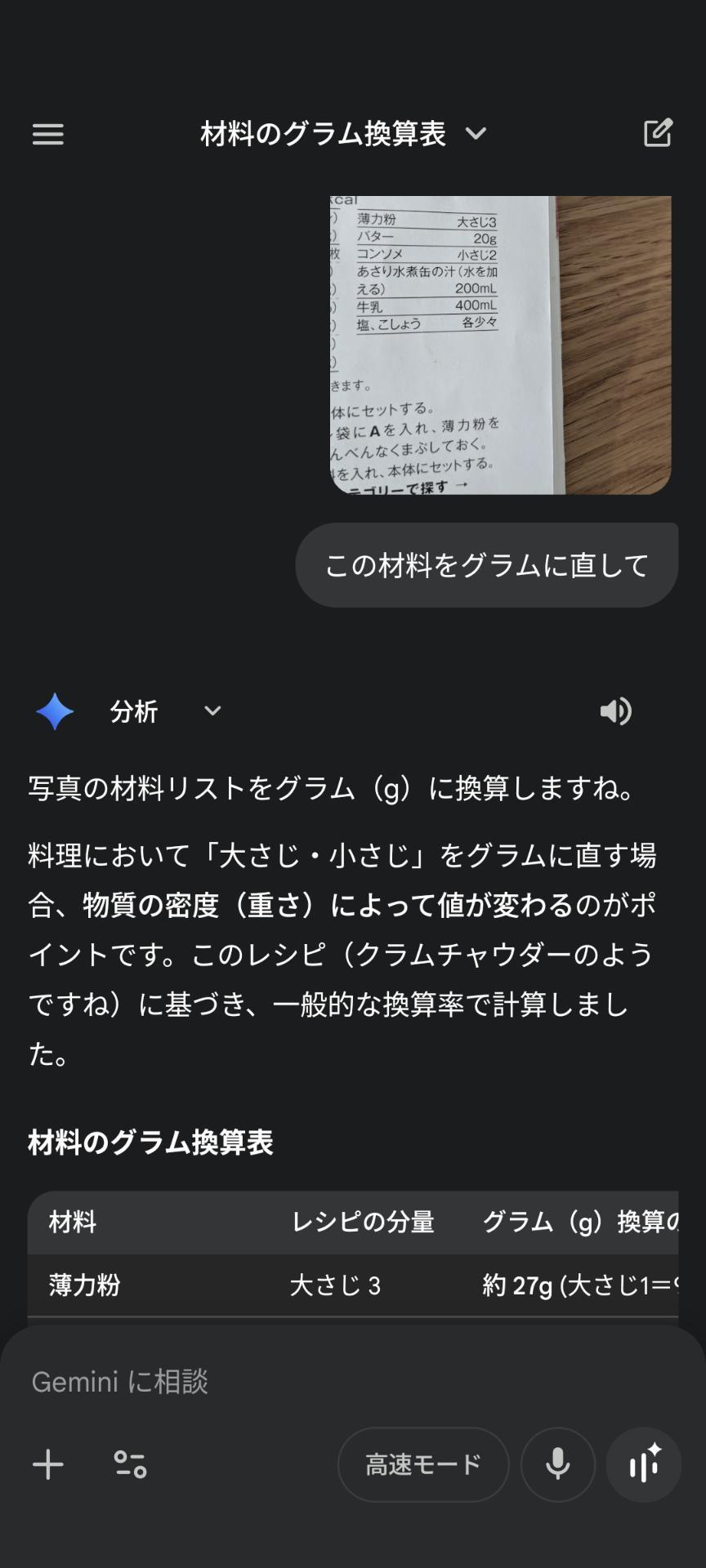 Coro@Coro@mstdn.maud.io (2026-01-12 20:21:22) レシピ本の写真撮って分量を重さに直してもらうの便利すぎ ---Attachments--- https://s3-mstdn.maud.io/media_attachments/files/115/881/860/941/016/517/original/e14dd3d7b42d49b7.jpeg